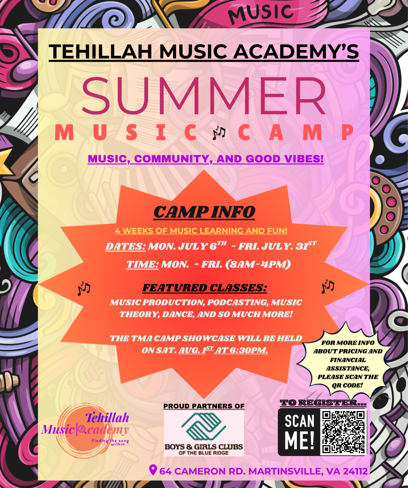 Explore the exciting opportunities at TMA Summer Camp! This is your chance to dive into engaging classes that cover everything from music theory and production to the rhythm and flow of dance. Our camp is designed not just to teach, but to inspire creativity and foster teamwork among participants. You'll have the opportunity to collaborate with peers, learn from experienced instructors, and develop your unique talents. The highlight of your camp experience will culminate in a spectacular community performance, where you’ll get to showcase what you’ve learned and the incredible skills you’ve honed! Whether you sing, play an instrument, or dance, we can’t wait to see you shine on stage. Come make unforgettable memories with us at Tehillah Music Academy!
